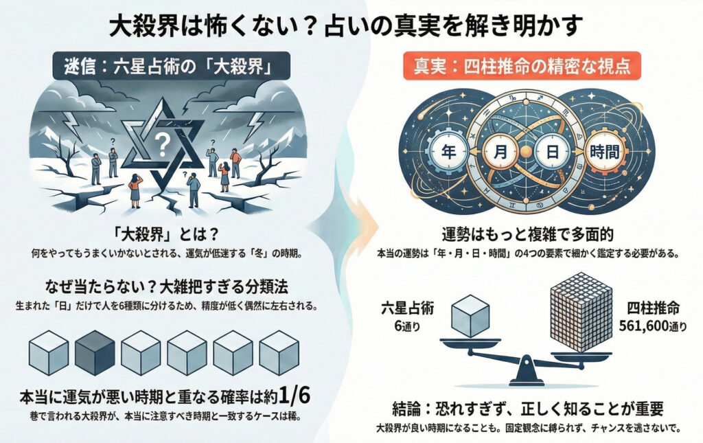 なので、四柱推命から観れば、「精度の粗い六星占術」でしか分けていない大殺界は、時として違っている時もあれば、合っている時もあり、結局本当に「大殺界」と呼ばれるような運気が悪い時は四柱推命ほど細かくは観ていないので全然割り出せず、それが当たるかどうかはほとんど偶然性にもよって成り立っているのです。