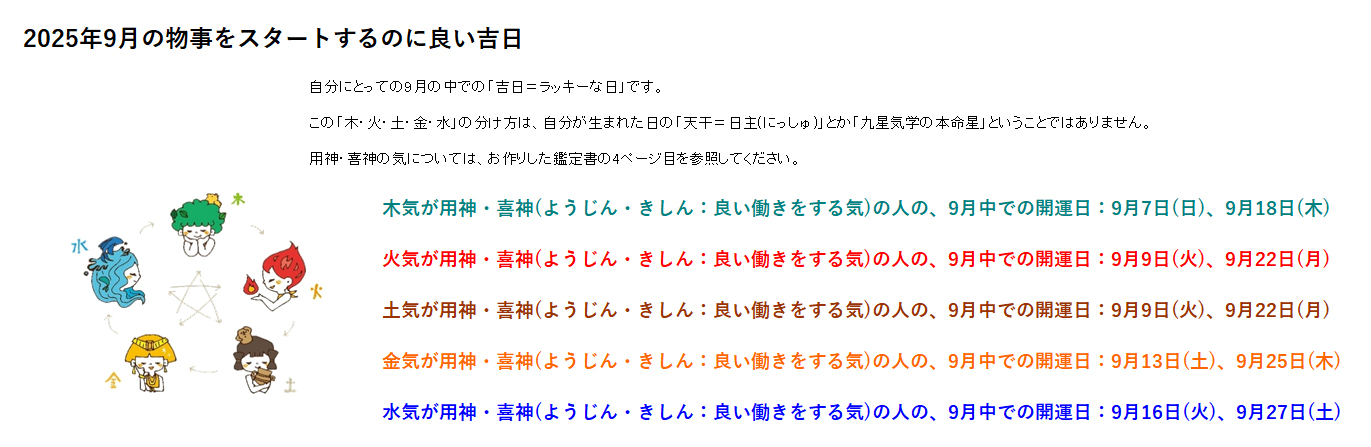 続いて9月の、木・火・土・金・水それぞれの気が開運となる方向けの、ラッキーデー情報です