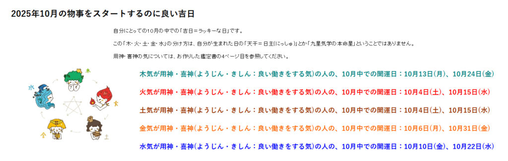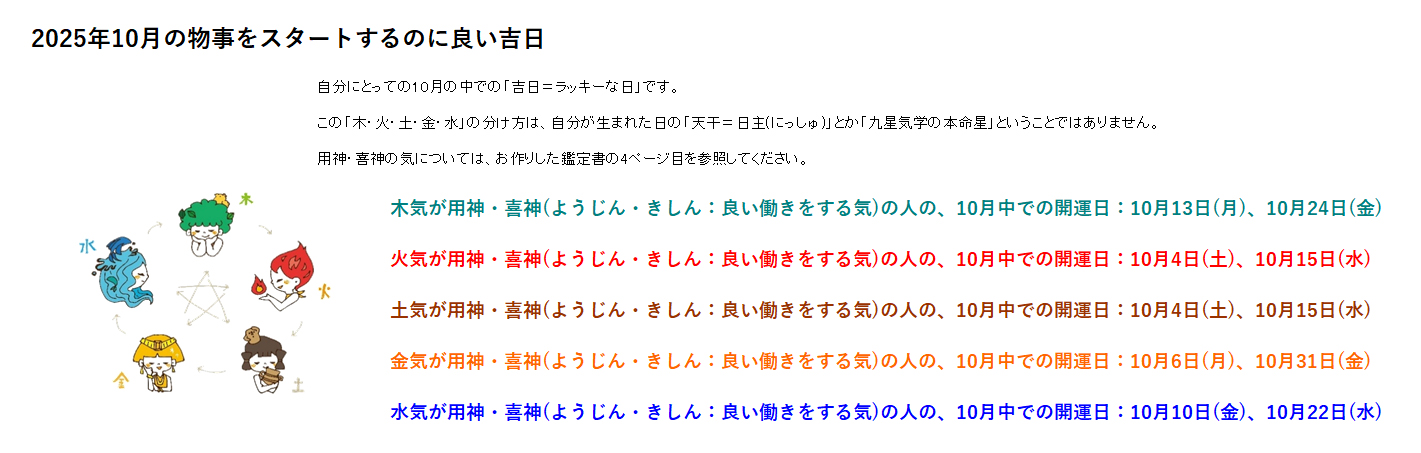 続いて10月の、木・火・土・金・水それぞれの気が開運となる方向けの、ラッキーデー情報です。
