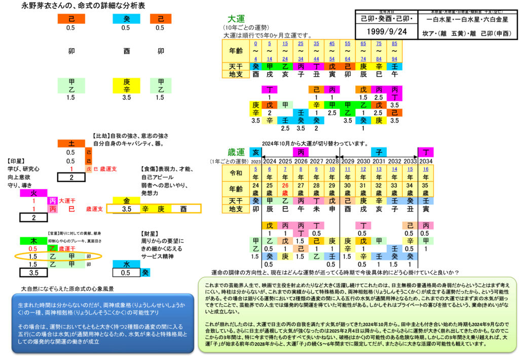 永野さんの命式も、小川市長と同じく<今までは>「外格(特殊格局)」として成功を得てきたタイプです。地支のうち三柱が酉と卯で構成されており、従勢格として生きる命式です。そして酉や卯は、軸として決して揺れ動かない正支の地支なので、この生き方は小川昌市長とは違って、変えることはできません。永野芽郁さんは、こうした芸能界の女優さんとしてしか生きる道は無いのです。