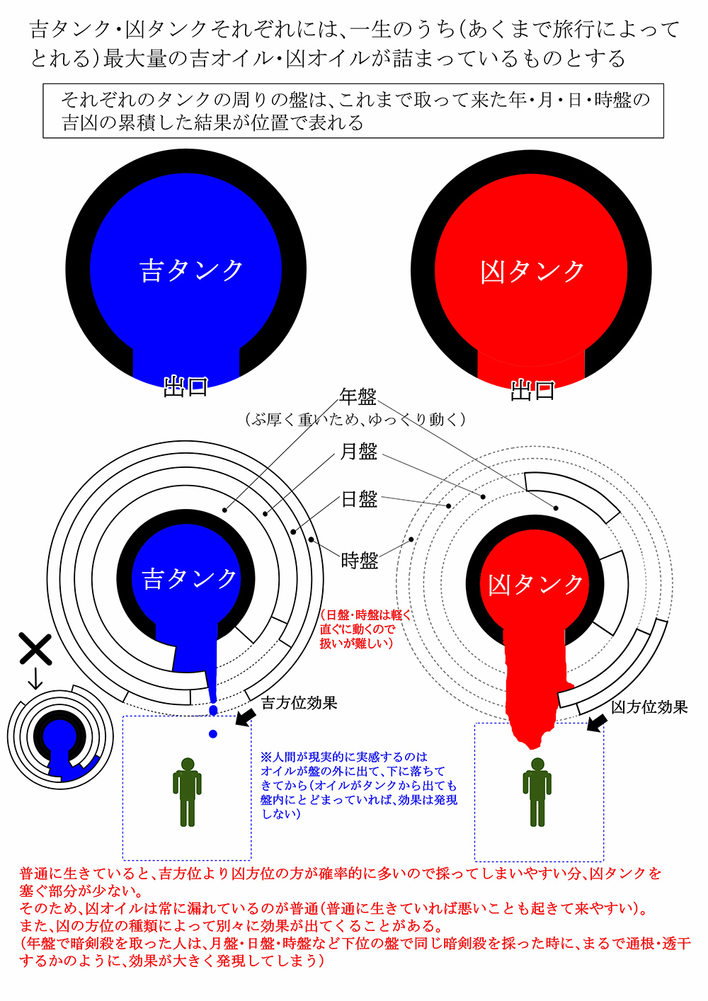 吉方位を採ったからといって、既に凶タンクから放出された分の凶オイルは相殺されません。ただし、盤の外に出なければ、現実的な凶現象は受けずに済みます。