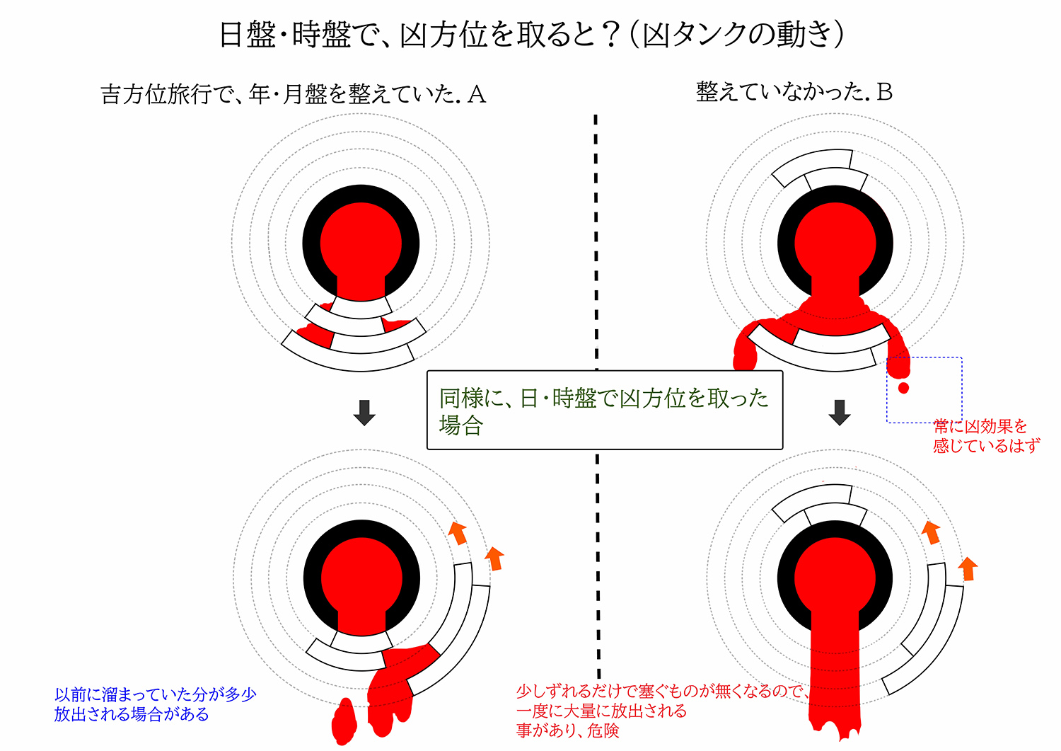 そこへ日盤・時盤で凶方位を採ると、塞ぐものが無くなり、一度に大量の凶オイルが放出される危険があります。