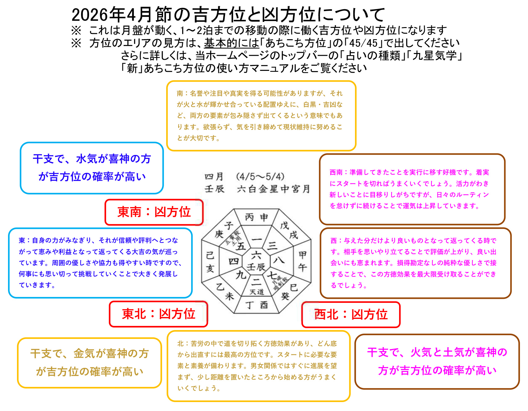 ※なお、東北、東南、西北は、今月は運気を下げてしまう「よくない方位」となります。