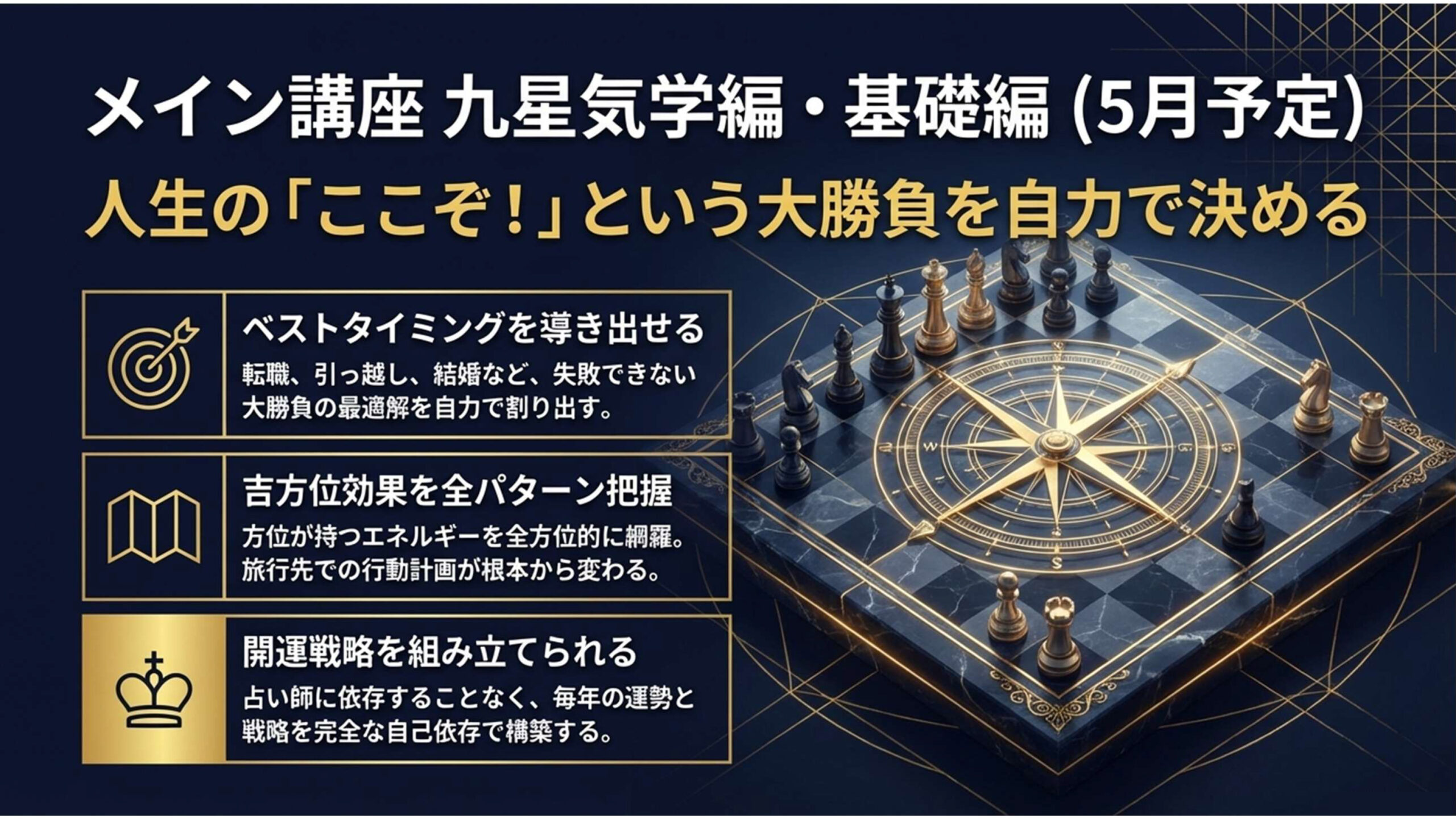 この講座では、五黄殺(じわじわと運気を腐らせる方位)、暗剣殺(突発的な災難が襲ってくる方位)、破れ(物事が根本から壊れる最も危険な方位) という三大凶方位の見分け方を、しっかりと学んでいただきます。
