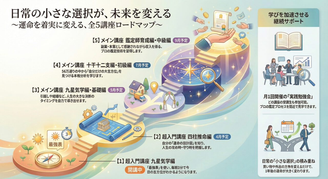 2026年は、皆さんが「自分の運命を知る」という最初のステップから、「一生使える技術を手に入れて、人から感謝されるプロになる」というゴールまで進めるように、全5本の講座ロードマップをご用意しています。